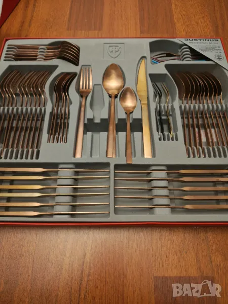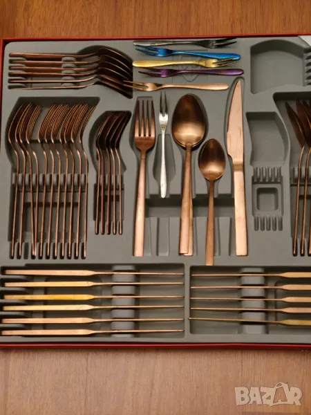 Нов луксозен великолепен сервиз неръждаема стомана в цвят антична мед .54 части 12 големи лъжици 12 вилици 12 чаени лъжичи 12 ножа и 6 изумителни малки вилички в различни цветове Превъзходни и на вид и на допир .от Америка .Кутията е от друг сервиз на солинген сложила съм ги там за да се съхраняват по качествено .Моля гледайте снимките .Не се продават отделно .ЦЕНАТА Е КРАЙНА .БАРТЕРИ НЕ МЕ ИНТЕРЕСУВАТ С ЕКОНТ САМО СЛЕД КАПАРО .