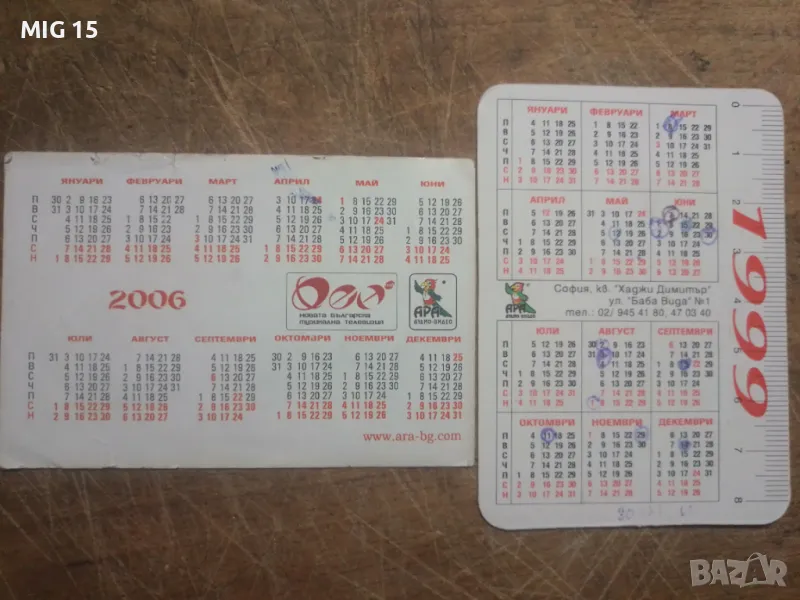 Продавам 2 стари календарчета на Ара Аудио Видео : от 1999 г с емблемата на компанията, и от 2006 г с певците и певиците. Цена : 5 лева на бройка.