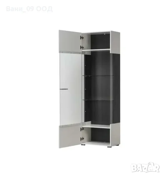 Визията съчетава бял цвят и тонирано стъкло, във вътрешното си разпределение, притежава 2 дървени рафта - горен и долен и 2 стъклени рафта, които придават на витрината разчупена визия и предразполагат към позиционирате любими сервизи и колекции в отличителна светлина.