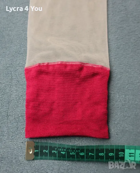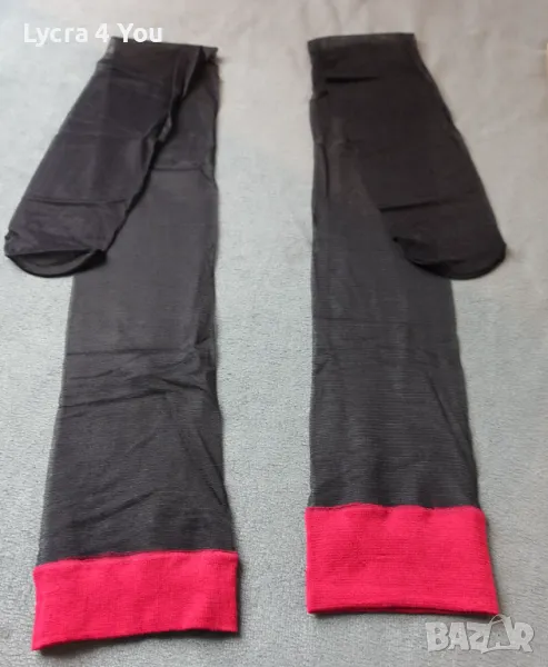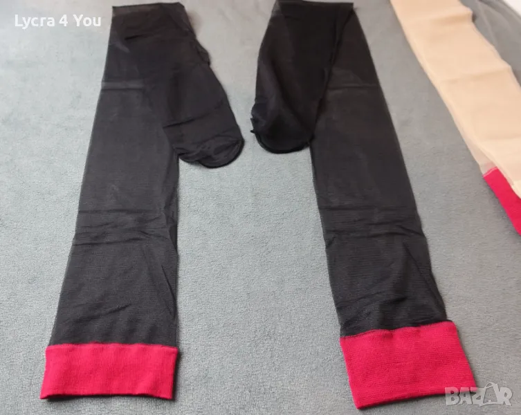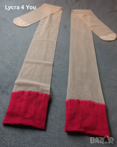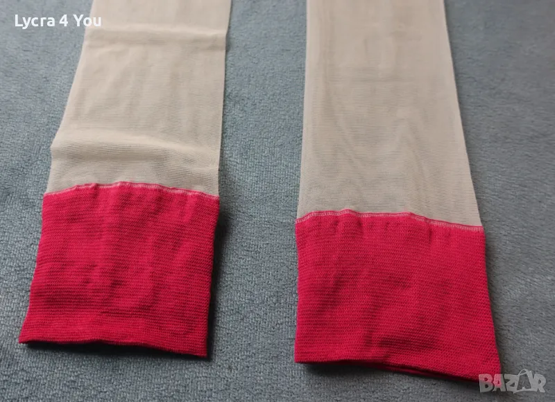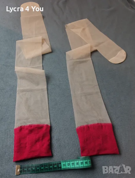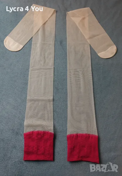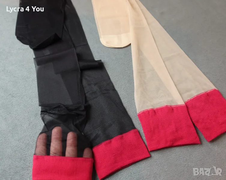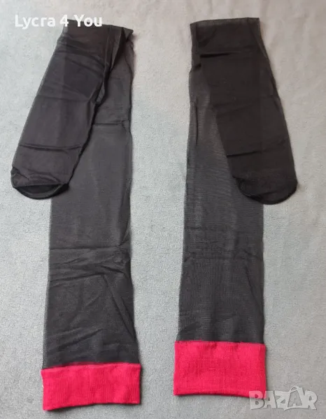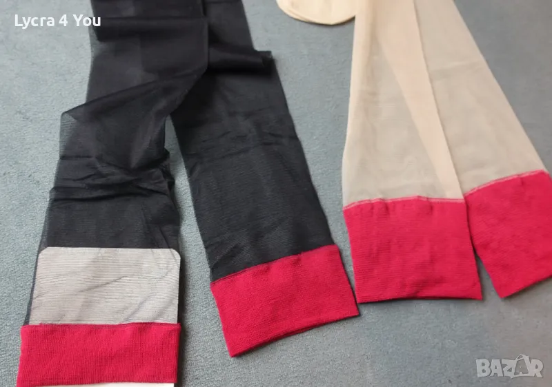 Дамски тънки прозрачни чорапи с широка червена лента в горната си част. Нямат силикон, но могат да стоят на краката, защото лентата е широка. Могат да се захващат и към жартиери.