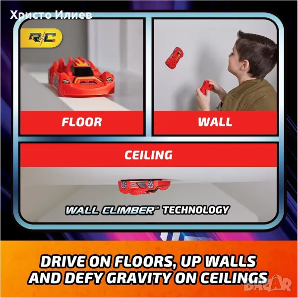 - ВЪТРЕШНА КОЛА С ДИСТАНЦИОННО УПРАВЛЕНИЕ: С патентованата технология Wall Climber тази червена кола играчка се движи по пода и по стените. За разлика от всички други RC автомобили, Wall Racer се противопоставя на гравитацията, като приближава с главата надолу тавана