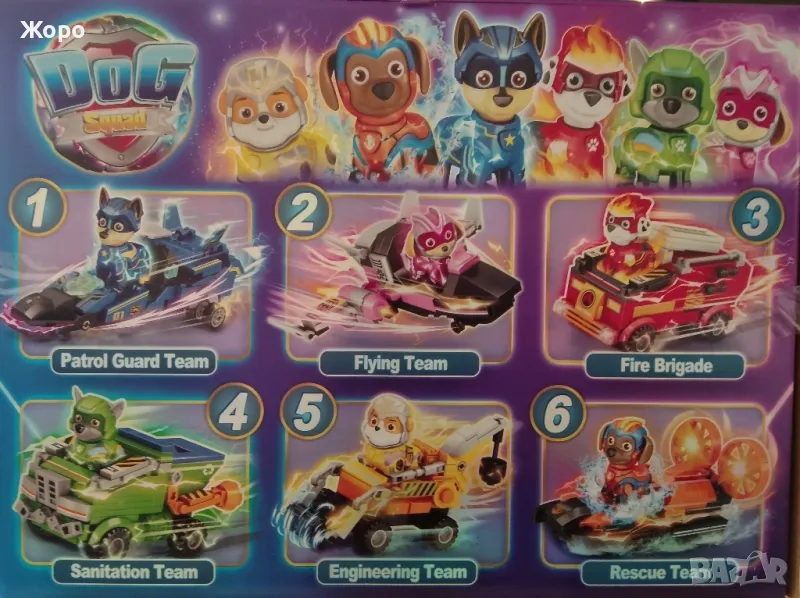 Конструктор "Героите от Пес патрул 6В1 състой от 6 различни конструктора които се продават поотделно ,всеки конструктор образува един от героите ,всичките шест конструктора заедно образуват целя отбор кученца