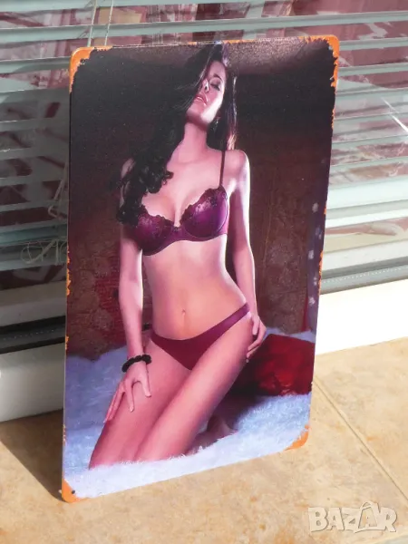 Метална табела еротика брюнетка по бельо желание страст очакване