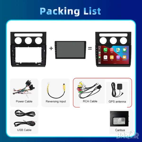 Пълен комплект с цялата рамка, преходни кабели и букси, декодери, предназначени и съвместими за монтиране на конкретния модел автомобил.