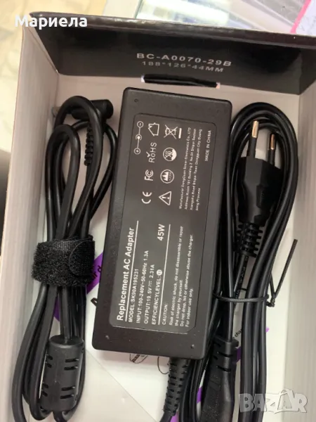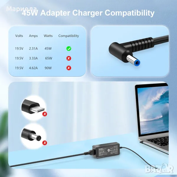 Макс. изходна мощност: 45W 19.5V 2.31A; Диапазон на входния волт: 100 - 240V / 50 - 60Hz ~ 1.8A; Размер на накрайника на конектора: 4,5 x 3,0 mm син накрайник за зарядно устройство за лаптоп HP Захранване Захранващ адаптер за променлив ток Замяна на кабел от DONGNI.