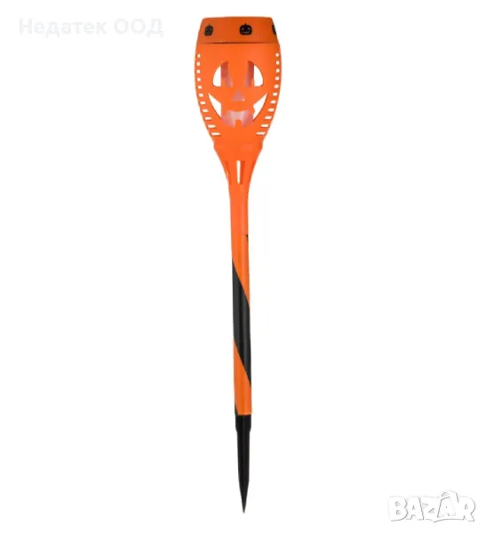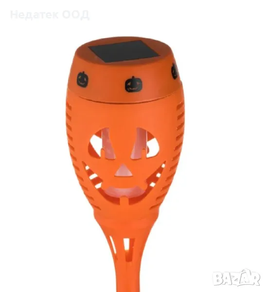Хелоуин слънчев фенер с пламък с ефект на оранжева тиква с малки черни тикви отгоре и оранжеви и черни линии в основата. Има ключ за включване/изключване.