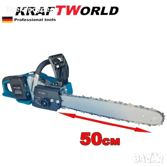 Новият немски акумулаторен верижен трион e захранван от две батерии по 36V. Той е високоефективен и с ниско ниво на шум при работа. Меката ръкохватка предпазва от приплъзване. Има регулируемо автоматично смазване на веригата. Индикатор показва нивото на зареденост на батериите. Веригата се настройва и опъва безпроблемно и не е необходимо да разполагате с инструмент. Спирачката се активира с помощта на предния предпазител за ръката. Ниското ниво на шум прави инструмента подходящ за използване на обществени места или в жилищни комплекси. Удобната предна ръкохватка и ергономичният корпус идеално пасват на ръцете на потребителя и осигуряват по-голям комфорт и ефективност по време на работа с инструмента.