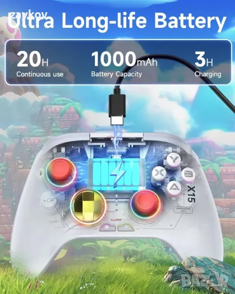 🎮【20 часа живот на батерията】Кажете сбогом на прекъсванията по време на вашите игрови сесии. Контролерът EasySMX X15 е оборудван с подобрена батерия от 1000 mAh, която предлага до 20 часа игра с едно зареждане. С дълъг живот на батерията можете да се потопите в игри за по-дълго, без да се притеснявате, че ще останете без захранване.