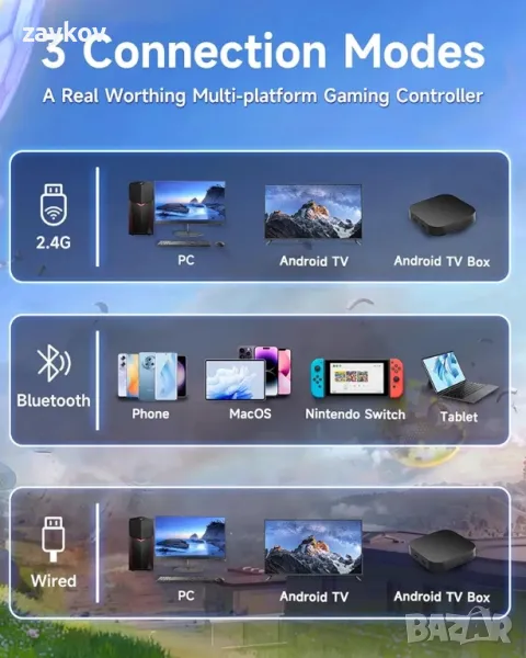 🎮【Универсална съвместимост】Нашият контролер е проектиран да бъде съвместим с множество платформи, включително PC, Switch, iOS и Android. Независимо на кое устройство предпочитате да играете, нашият контролер осигурява безпроблемна свързаност и плавен геймплей на множество платформи, осигурявайки гъвкавост и комфорт.