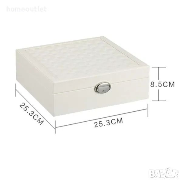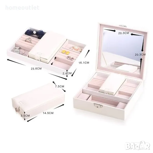 Подходящ за: обеци, висулки, пръстени, гривни, колиета, часовници и др. Капакът е снабден с огледало.