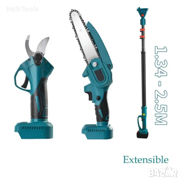 3в1 Градински Комплект Телескопичен Прът Акумулаторна Ножица и Резачка За Клони и Лозета 36V 8,0AH ТАЙГА