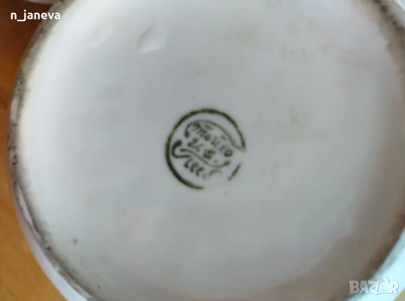 и чайник с височина 12 см. Чинията е с печат от "Стойко Ив. Пеев" българска продукция.