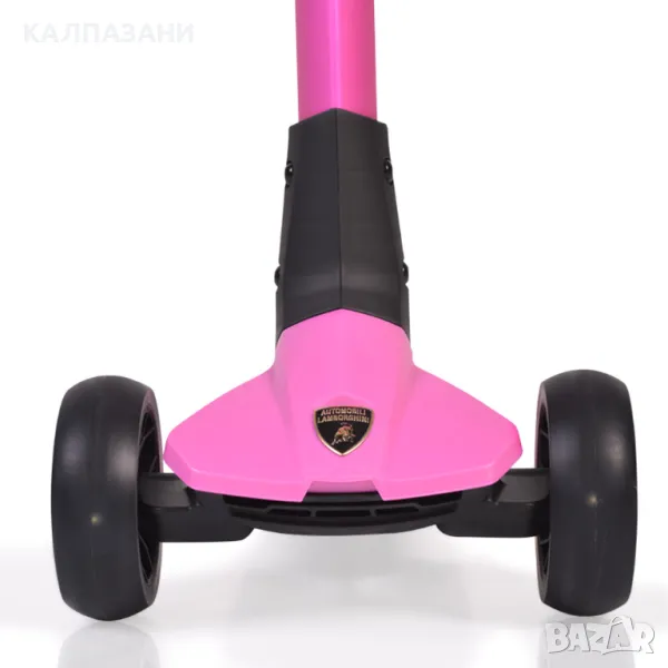 Сгъваема детска тротинетка сертифицирана с лиценз от Lamborghini; Материал: Алуминиум и РР(Полипропилен); Ръкохватки: ТРЕ 12см;Осмоъгълна форма; Тръба на кормилото: Алумиева в триъгълна форма с регулиране на височината от 70 до 82см; Сгъване със завъртане на кормилото; Алуминиева скоба за стягане и алуминиеви лога; Колела светещи PU: 120*40мм предни; 80*40мм задно; Лагери: Carbon ABEC-7; Основа за стъпване: размер 120*335мм с гумирано покритие; За деца на възраст 3+; максимална товароносимост 50кг;