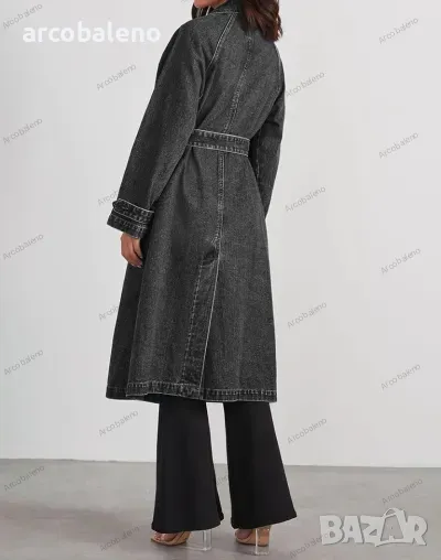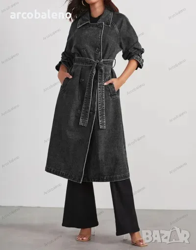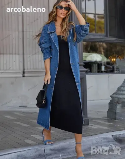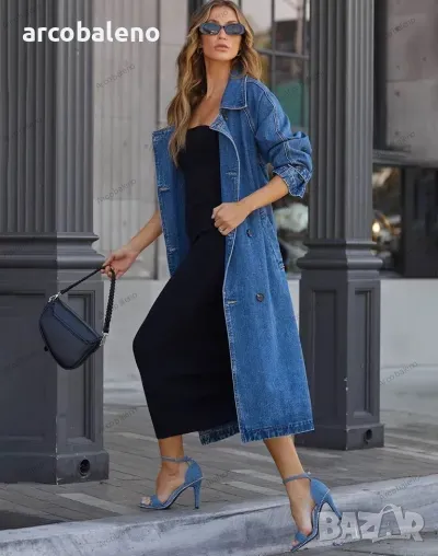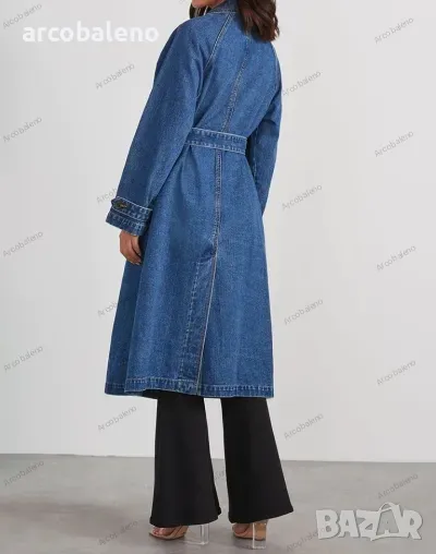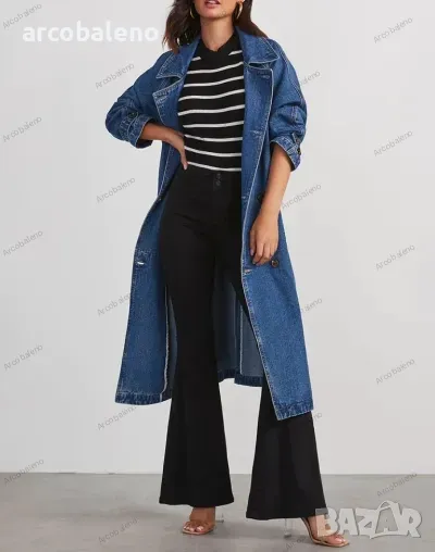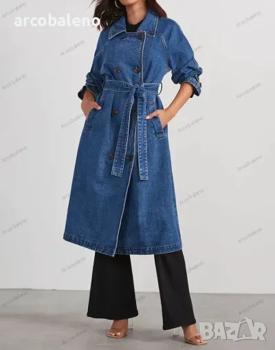 Дамско дънково памучно едноцветно свободно манто с дълги ръкави, копчета и двойни джобове