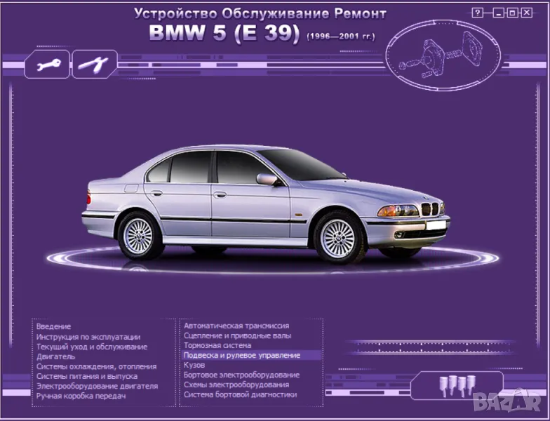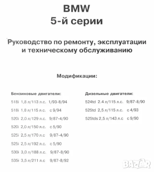 1.BMW 5(E39) 1996-2001.Това ръководство обхваща модели BMW Серия 5 с редови шестцилиндрови бензинови двигатели (DOHC) 2.0, 2.3 и 2.8 l,
