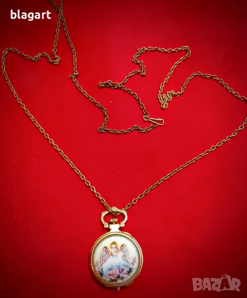 Много рядък часовник-колие. РАБОТИ перфектно,не е използван. Механичен-17рубина., Позлата и ръчно рисуван емайл върху метал -"Ангел хранител". Производство-СССР-вече не се произвеждат такива. Красота !