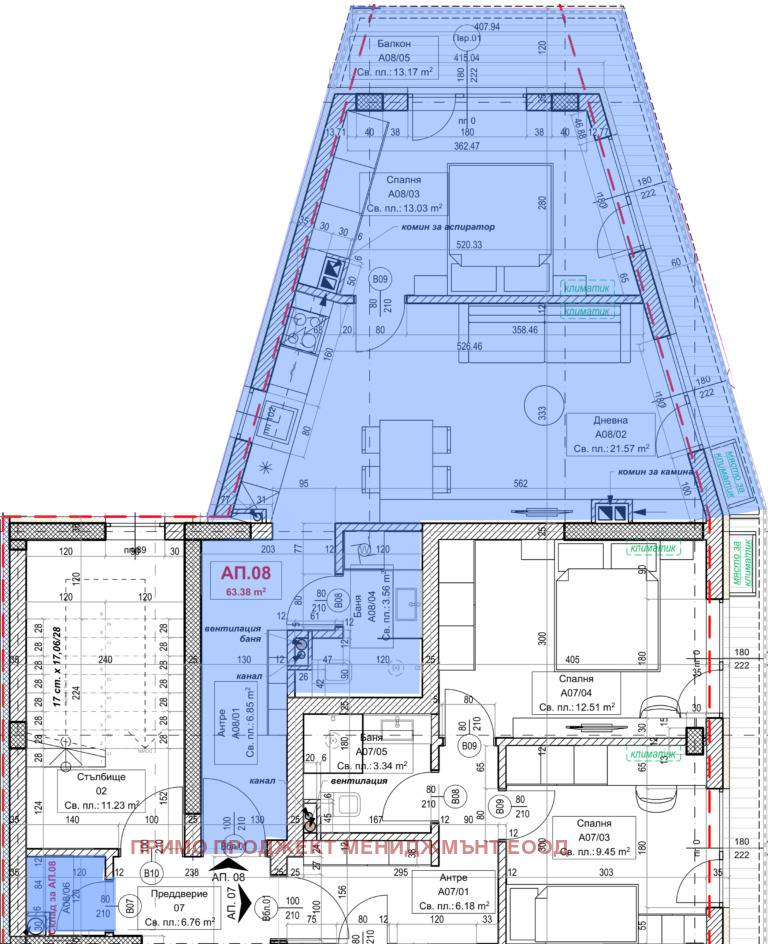 Чиста площ - 63,38 кв.м.; Обща площ - 77,33 кв.м.