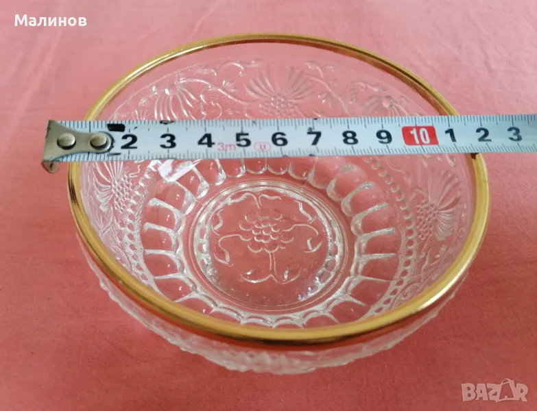 Стъклена купичка с релефна украса и златист кант по ръба, за ядки, дребни плодове, бонбони и др. Налични 2 броя, цената е за бройка.