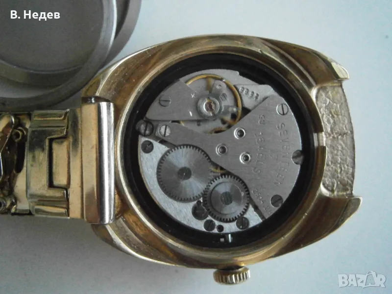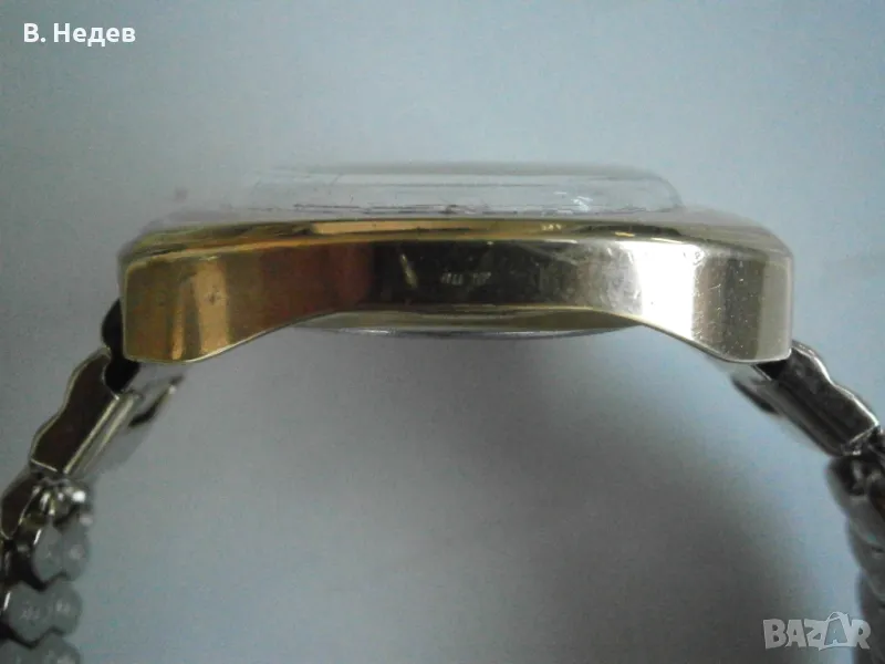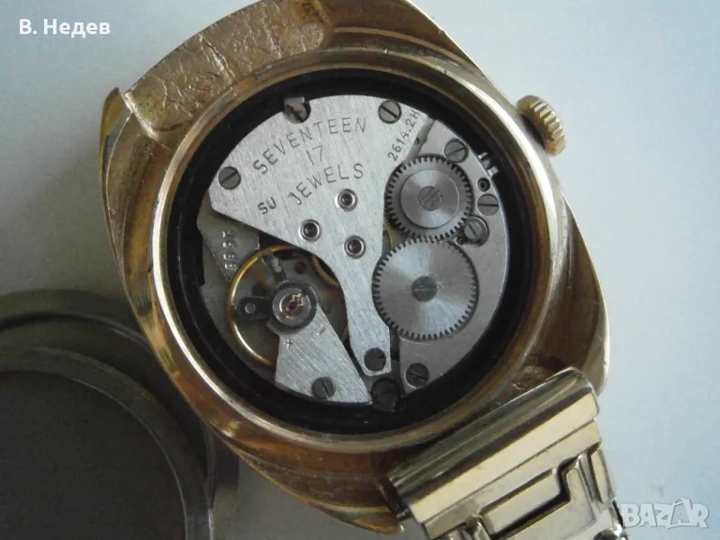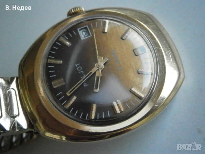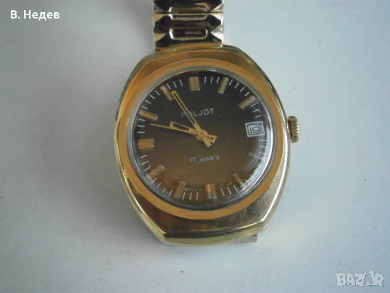 Продаваме този великолепен руски /съветски/ часовник - много запазен - като нов! Ръчно навиване, отлично състояние - циферблат, индекси, стрелки, машина - супер състояние; моля разгледайте подробно снимките! Касата е без протривания, перфектна! Часовника е с качествена машина - калибър 2614.2Н, със 17 рубинови камъка, противоударен прецизен баланс, централна секундарна стрелка, амортисиори на баланса и анкъра - действително противоударен часовник. Надеждна и безотказна машина. Вибрации на баланса - 18000/час. Часовникът поддържа мн. точно време за механичен часовник – откл. до +30-40sec/ 24 h. Запас на хода - около 39- 40 часа. Надписите върху циферблата: POLJOT, 17 jewels, made in USSR. Часовника е в перфектно състояние, което личи от външния вид... Отново се връщам на касата - позлатена, 10 микр., маркирана - без нарушения дори по ръбчетата! Страхотен мъжки размер - 37,0 х 42,5 мм диаметър на корпуса, без коронката. Часовникът е с стоманена разтегателна верижка, PVD златно покритие. Широчина при лъговете - 18 mm. Височина със стъклото – 13,0 мм.