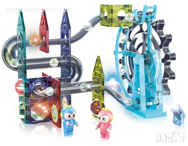 Магнитни цветни фигурки с тематика строителство, писта за топчета в различни форми за безброй конструкции и уникален дизайн, виенско колело Пакетът съдържа 80 фигурки за композиции.
