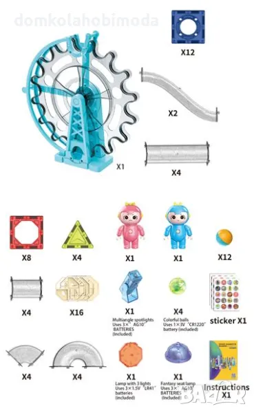 Магнитни цветни фигурки с тематика строителство, писта за топчета в различни форми за безброй конструкции и уникален дизайн, виенско колело Пакетът съдържа 80 фигурки за композиции.