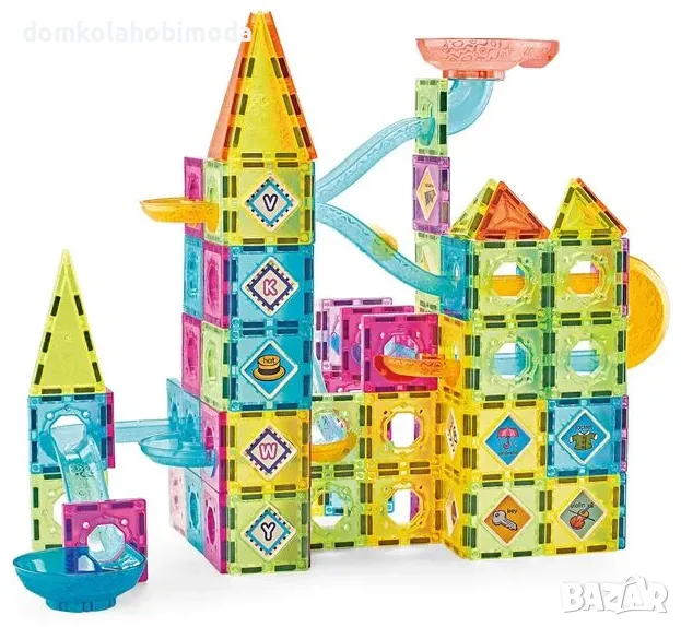 Магнитни цветни фигурки с тематика строителство и писта за топчета в различни форми за безброй конструкции и уникален дизайн. Пакетът съдържа 139 фигурки за композиции.