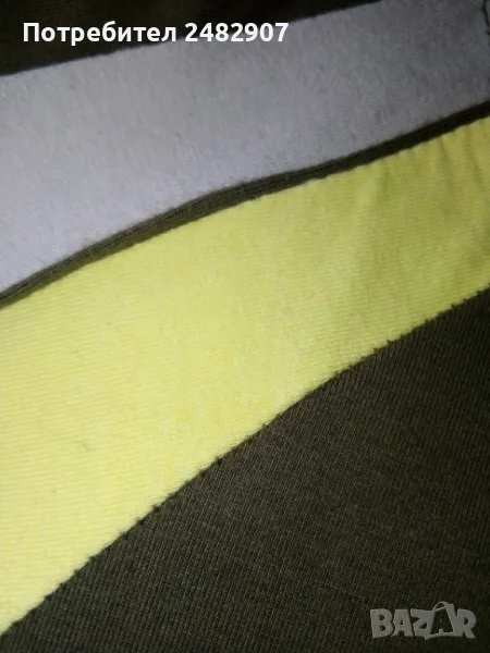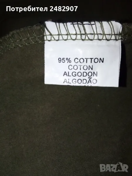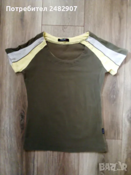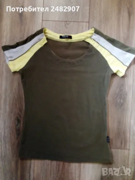 Дамска блуза с къс ръкав в маслено зелен цвят. Съдържа 95 % памук и 5 % еластан. Ширина под мишниците - 40 см, ширина в долната част - 40 см, дължина от рамото до долу - 55 см, ширина на ръкава в долната част - 13 см. Много запазена, почти не е използвана.
