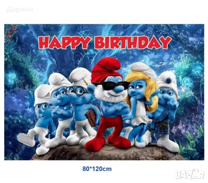 Парти сет украса Смърфовете - 30бр. части: 16бр. латексови балони, 30см., 1бр. банер 12,7/17.4см., 12бр. топери 5,4/6,4см. и 1бр. топер за торта 16/10см. - 40лв. /20.45€. Винил 120/80см. - 25лв./12.78€. Парти сет балони Смърфовете - 17бр. балони - 16бр. латексови балони, 30см. и 1бр. цифра 80см. от 1 до 9г. - 25лв./12.78€. Нови.