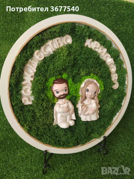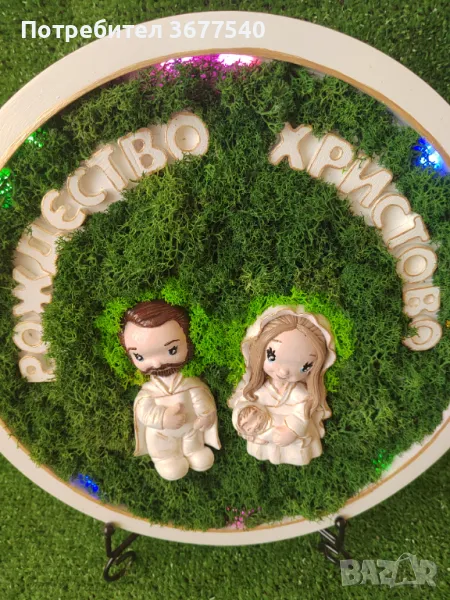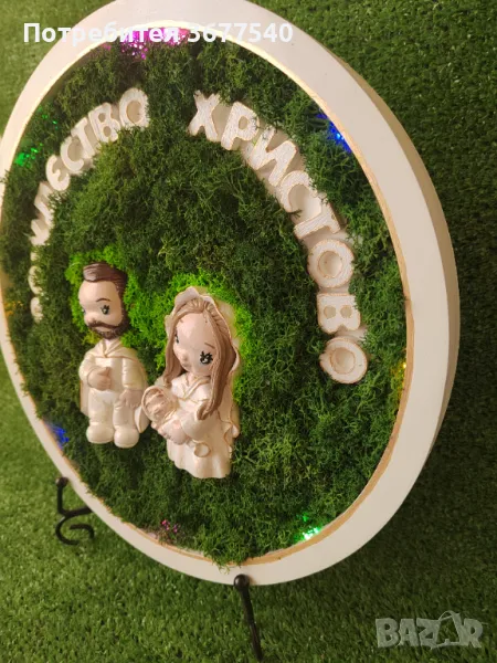 Прекрасно предложение за вашия дом или подарък – **Керамично пано/лампа "Рождество Христово"** с диаметър 30 см! Тази уникална декорация е ръчно изработена от висококачествена керамична смес и декорирана със скандинавски мъх, което придава на изделието изящен и естествен вид. Пано-то може да бъде използвано като декоративна лампа, създаваща уютна и топла атмосфера в дома ви, особено по време на коледните празници.