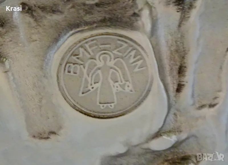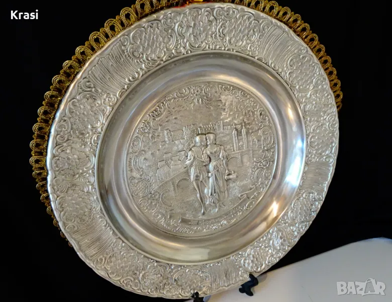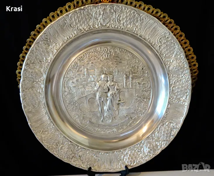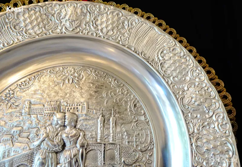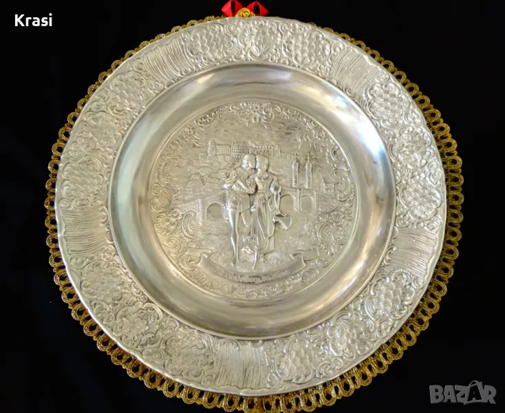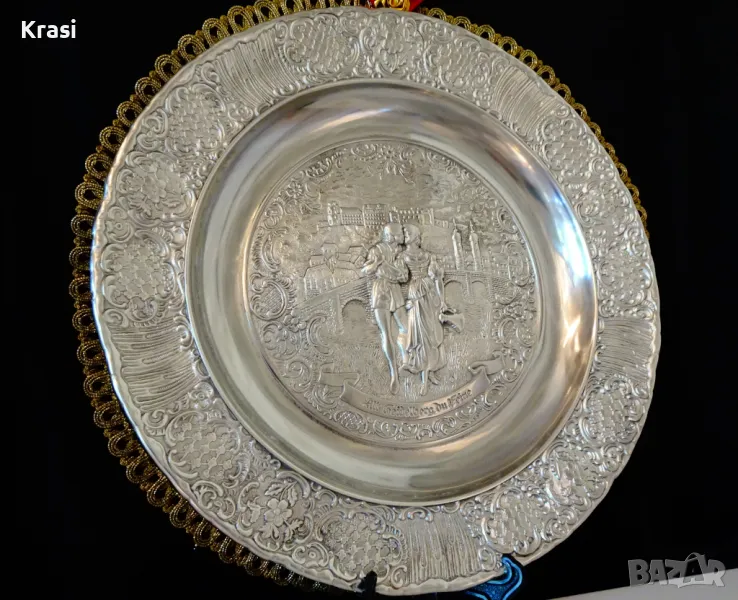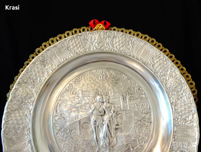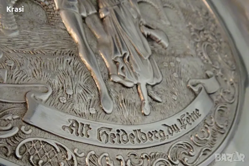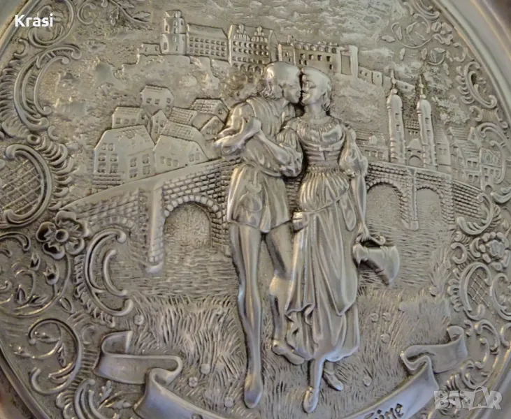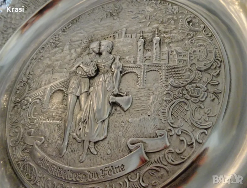 Западно Германско пано,чиния за стена,релефна картина,майсторска ръчна изработка от 95% калай и 5% сребро на марката BMF,маркирана.Прецизно изваяната сцена е вдъхновена от стихотворението „ Alt Heidelberg, you good “ на Джоузеф Виктор Шефел,което оживява в песен,а през 1913 година и в немски романтичен филм с участието на Хюго Флинк и Хеда Върнън в главните роли на двойката влюбени.Студентския живот в стария университетски град Хайделберг е вплетен с драматична любовна история,домашен уют и местен колорит.Зад красивата двойка се вижда моста Alte Brücke над река Nekar и Замъка Хайделберг.Периферията на паното е декорирана с разкошни релефни цветя и орнаменти в стил барок.Между картината и париферията има възможност за гравиране на текст.Паното е със стабилна окачалка за стена.Забележително произведение на изкуството,незабравим подарък и вечен спомен за сватба,младоженци,калаена сватба,10 годишнина,студент,абсолвент.Диаметър 31 см.,височина 3 см.,тегло 800 гр.