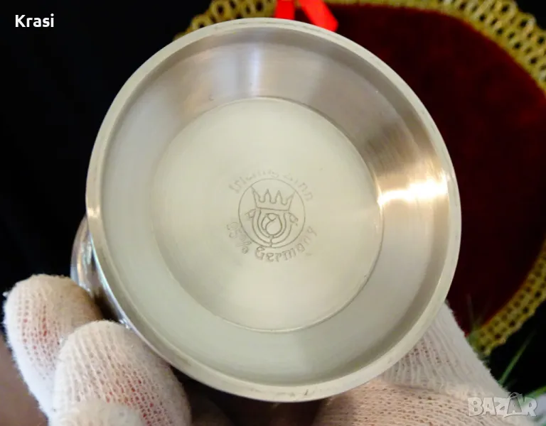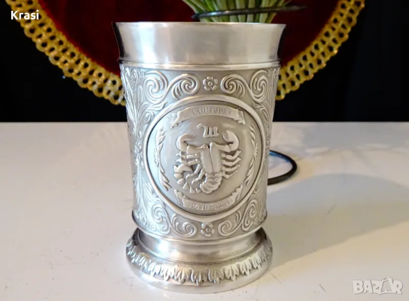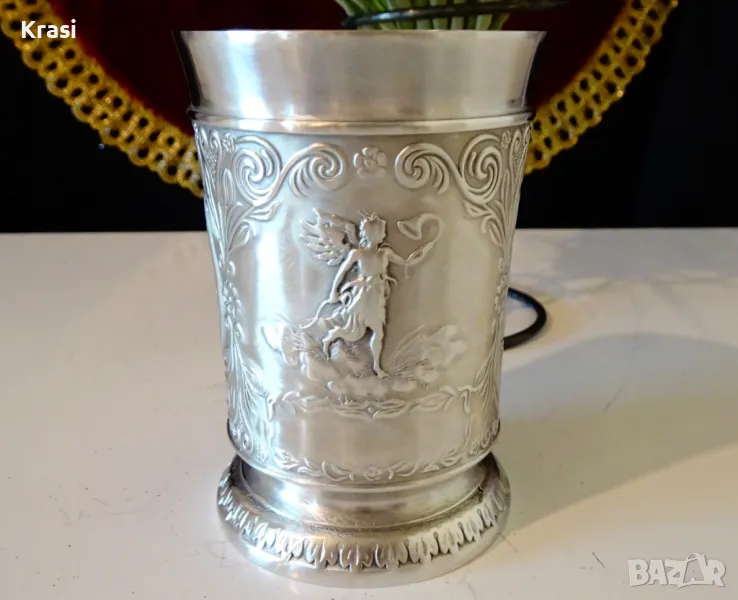 Старинна немска чаша за вино,майсторска ръчна изработка от 95% калай и 5% сребро,маркирана със знак за високо качество.Декорирана с три релефни картини - двойка влюбени на пикник сред природата с кученце,Богиня Фортуна - щастие,изобилие,късмет и зодия Скорпион.Изображенията са разделени от ефектни релефни орнаменти и цветя.Височина 8 см.,диаметър 5.5 см.,тегло 120 гр.Вместимост 120 мл.Перфектно състояние,блести като сребро.
