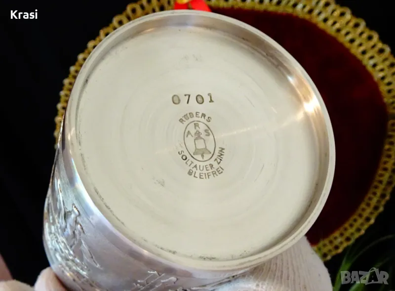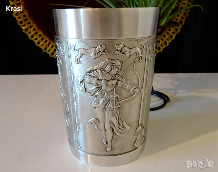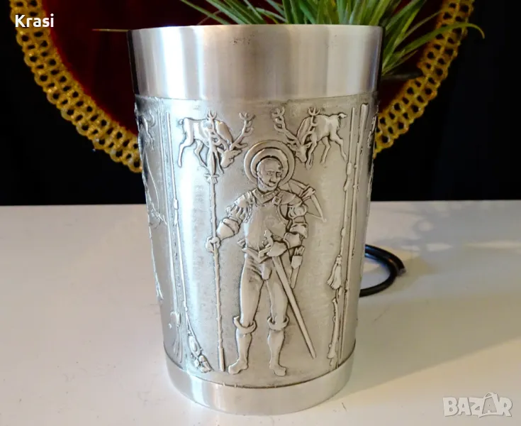 Старинна немска чаша,халба,майсторска ръчна изработка от 95% калай и 5% сребро,маркирана Röders soltauer zinn bleifrei.Декорирана с четири уникални ловни картини,които представят еволюцията на лова във вековете.Изображенията са разделени от различни ловни орьжия и аксесоари.Неповторимо качество,масивност и блясък като на сребро.Височина 11 см.,диаметър 7.5 см.,тегло 310 гр.Вместимост 250 мл.