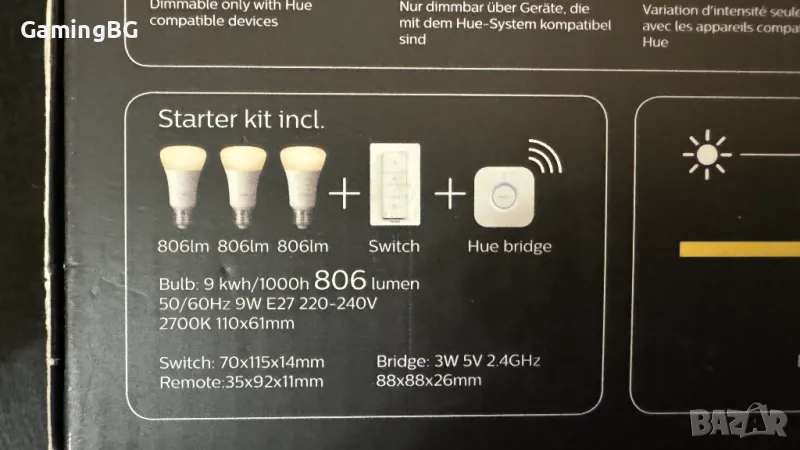 PHILIPS Hue Starter Kit E27, 3 лампи 806lm + Hue Bridge v2 + Hue димиращ суич 160,00 лв.