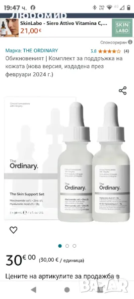 Двата най-популярни и най-продавани продукта от The Ordinary обединяват усилията си в този набор от стойности, за да преосмислят тена ви.Какво има вътре The Ordinary Skin Support Set: Niacinamide 10% + Zinc 1% - 30ml & V2 Next Gen Hyaluronic Acid 2% + B5 - 30ml.
