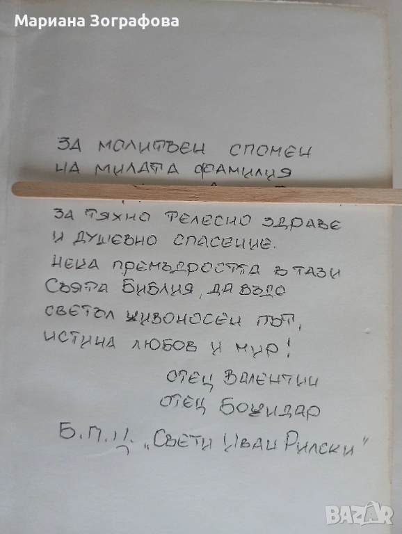 В Библията ма посвещение до семейство, по случай кръщаването на децата им, от отец Валентин и отец Божидар, които освещават първата Българска Православна Църква "Свети Иван Рилски" в Чикаго, С.А.Щ.
