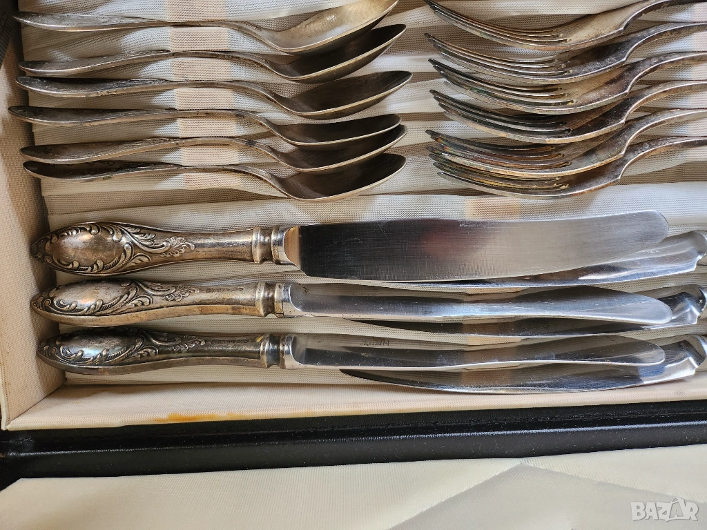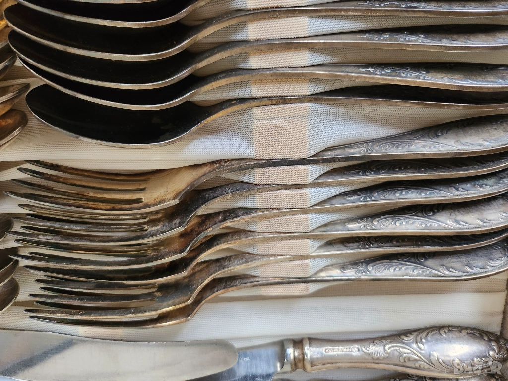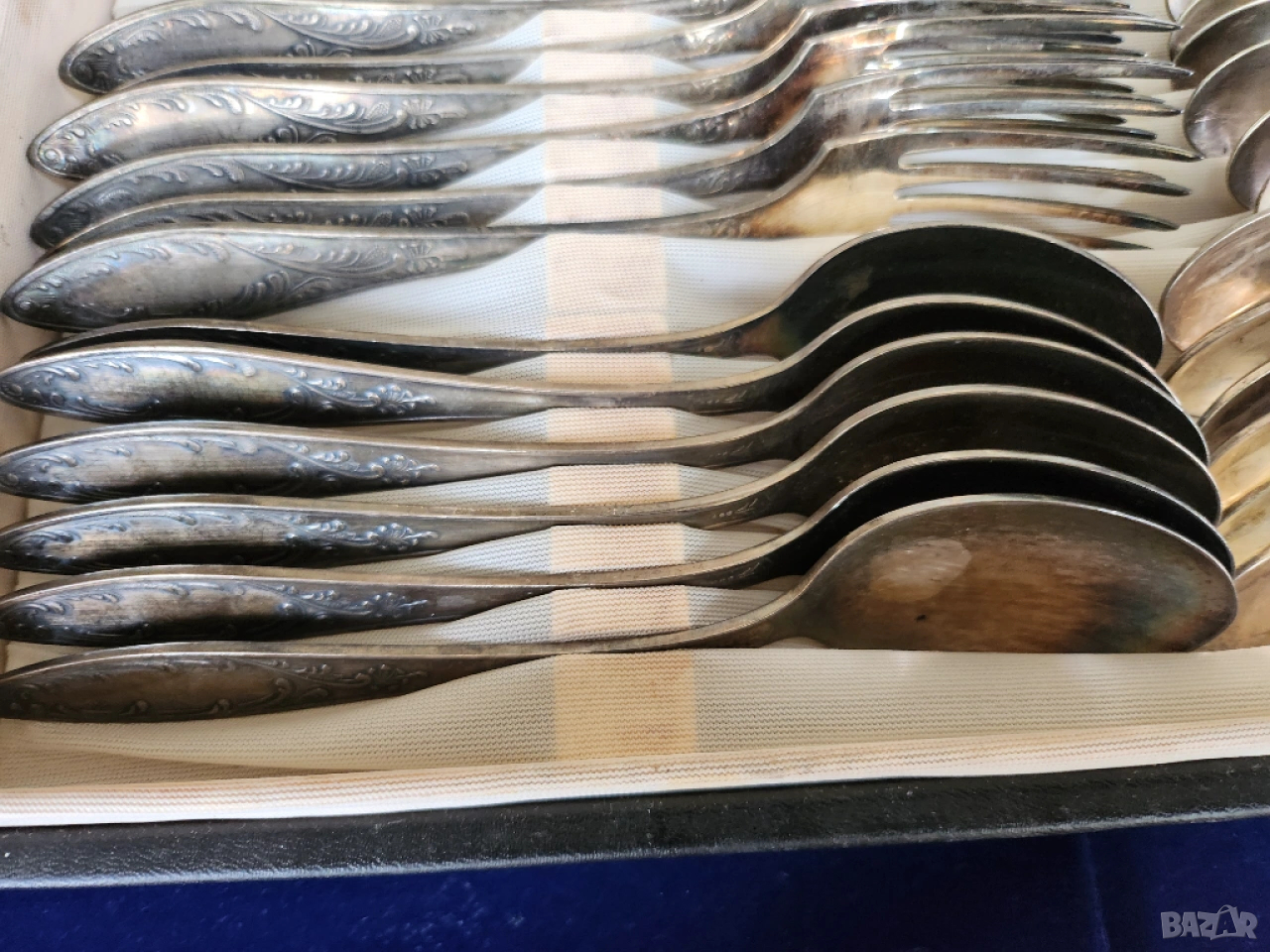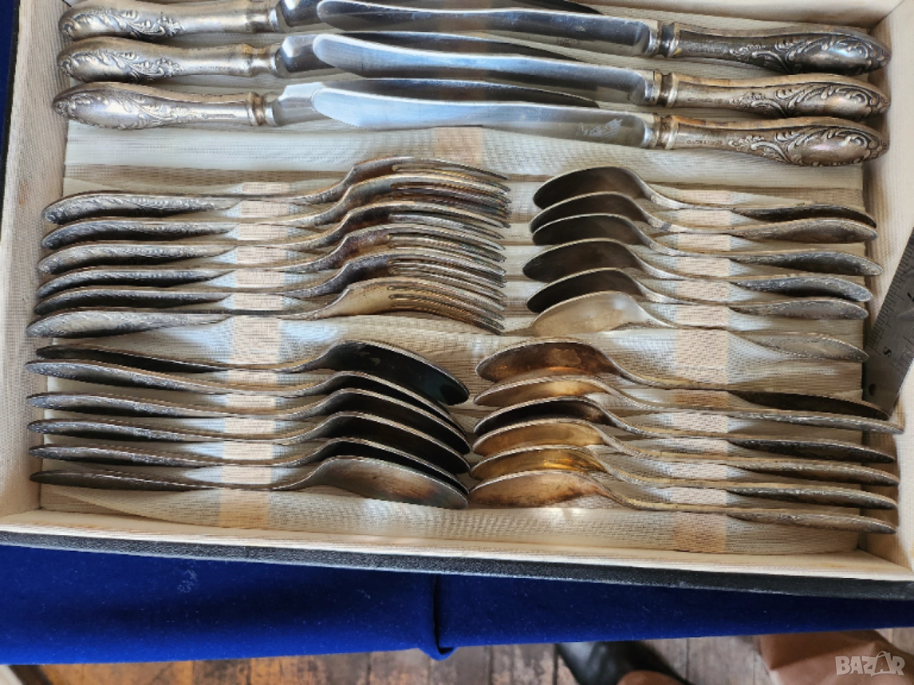 Състои 30 прибора, качествена и красива изработка от дълбоко посребрен мелхиор.