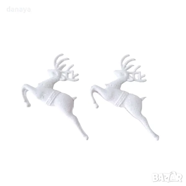 Комплект от 2 броя коледни играчки за елха бели препускащи еленчета. Добавете празнична магия към вашата коледна украса с този изящен комплект от две бели брокатени еленчета. Всяка играчка е с размери 10×7 см и е покрита с бляскав брокат, който придава елегантен и празничен завършек. Тези декоративни украшения са перфектни за украса на коледната елха или за създаване на уютен коледен кът.
