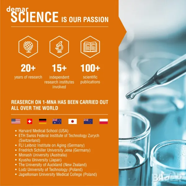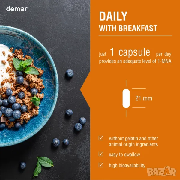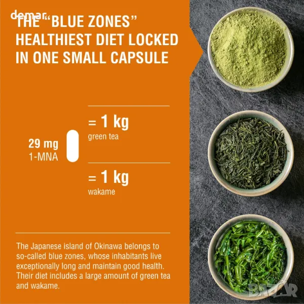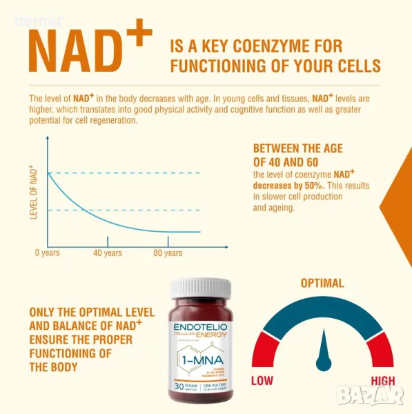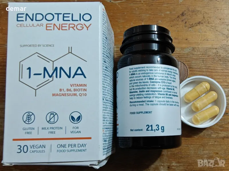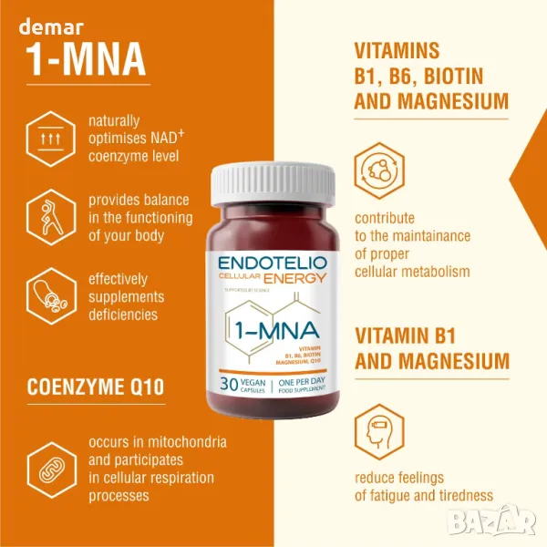 1-MNA е естествено срещаща се в тялото молекула, извлечена от ниацин, която поддържа оптимални нива на NAD+, от решаващо значение за физическата активност, когнитивната функция и клетъчната регенерация, особено когато NAD+ намалява с възрастта. Открит във високи концентрации в чая уакаме и матча, 1-MNA е ключът към дълголетието, както се вижда в Сините зони като Окинава, където жителите се радват на изключително здраве и продължителност на живота. Всяка капсула Endotelio доставя еквивалента на 1 kg зелен чай или уакаме, подсилен с коензим Q10, витамини B1, B6 и биотин и магнезий за подобрено клетъчно здраве и намалена умора. Подкрепена от над 20 години изследвания и повече от 100 научни публикации, тази подходяща за вегани формула е предназначена за ежедневна употреба за насърчаване на енергията и когнитивната функция, направена с първокласни съставки в ЕС.