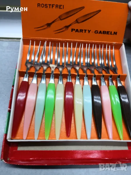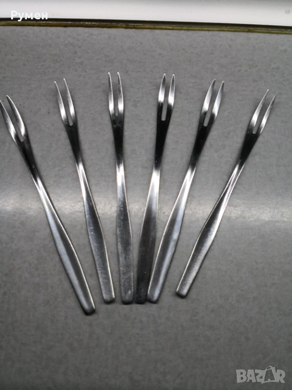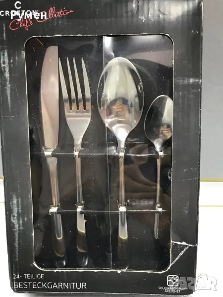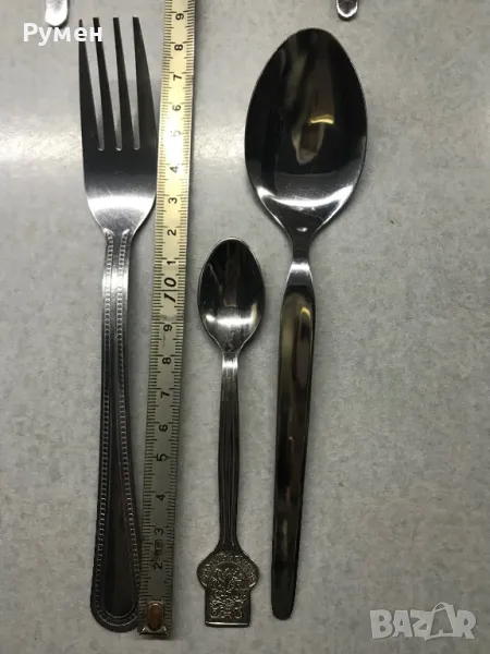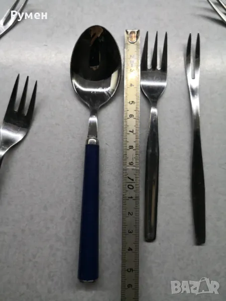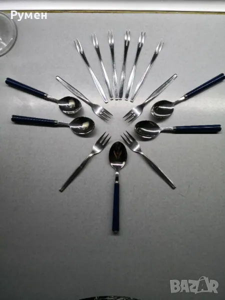 Съдовете са инокс - стомана 18/10, използвани: тенджера 2,5 л. 25 лв., касерола 1,2 л. 20 лв., с тройно дъно, лъжички нови 5 броя, коктейлни вилички 6 броя, десертни 4 броя - по 2,50 на WMF