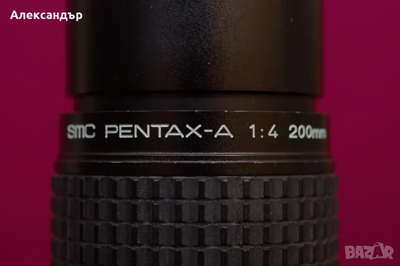 Pentax A 200mm f4 - един дълъг и твърд обектив, който съчетава качествата на твърдите обективи и компактните размери. Освен малките си тегло, този обектив притежава многослойното покритие на Pentax против вътрешни отражения и хроматични аберации; режим на блендата А, който позволява употребата на обектива с "матричното" мерене на Pentax и автоматични светкавици. Обективът е ръчнофокусен и не разполага с автоматичен фокус, но за сметка на това има изключително удобна фокус-гривна и ниска цена. Ако обичате да снимате отдалечени обекти или да изолирате обекти от общ план, то този обектив ще ви бъде отличен помощник. Снима рязко и има натурално цветопредаване. Проектиран е за филмови тела, така че освен с всички APS-C тела работи и с K-1.