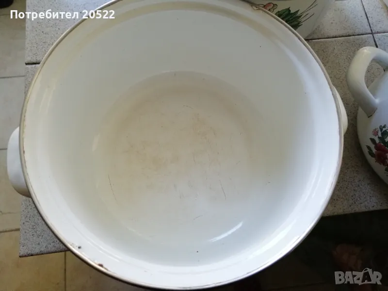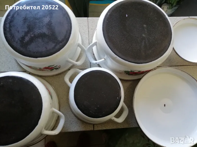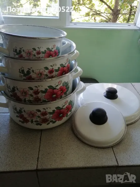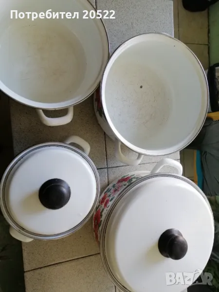 Четири броя използвани тенджери. Голямата е най- много ползвана. Другите с нормални следи от употреба. Емайлирани. За съжаление две от тях са без капаци. Красив декор.