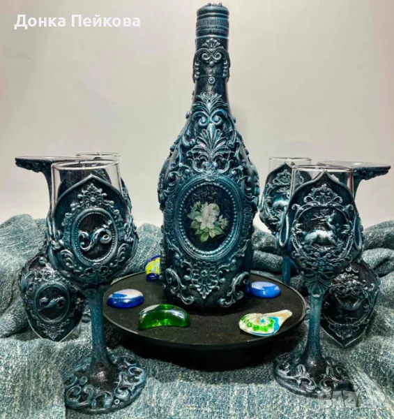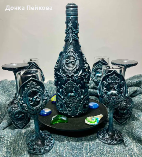 с имитация на старо сребро- един впечатляващ подарък за годишнина, за Рожден Ден, за абитуриентска, за сватба, за годишнина, подарък с който гарантирано ще впечатлите всички! Комплекта е единствен и няма да има друг такъв, което го прави уникален. Съдържа бутилка (която можете да напълните с алкохол по ваше желание) + 6 чаши. За изработката са използвани безвредни и водустойчиви материали. Може да се мие с мека гъбичка и без накисване. Да не се мие в съдомиална машина и да не се мие с гореща вода. Допълнително към комплекта може да бъде изработена и малка, персонална картичка, с картинка и текст по ваш избор, която ще бъде привързана ефектно към бутилката (+5 лв).