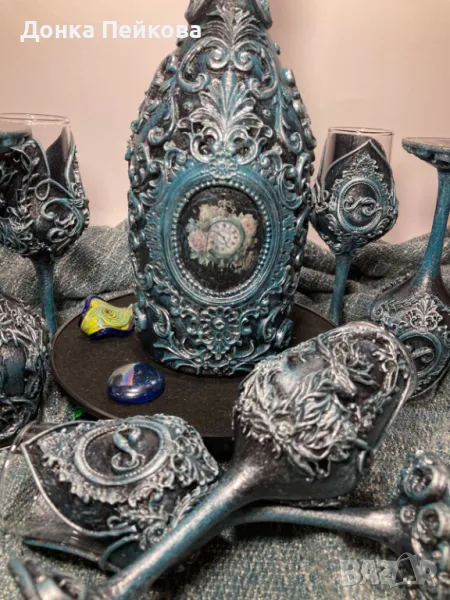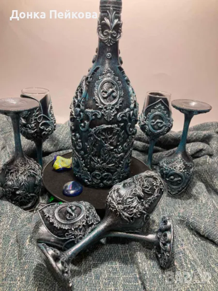 с имитация на старо сребро- един впечатляващ подарък за годишнина, за Рожден Ден, за абитуриентска, за сватба, за годишнина, подарък с който гарантирано ще впечатлите всички! Комплекта е единствен и няма да има друг такъв, което го прави уникален. Съдържа бутилка (която можете да напълните с алкохол по ваше желание) + 6 чаши. За изработката са използвани безвредни и водустойчиви материали. Може да се мие с мека гъбичка и без накисване. Да не се мие в съдомиална машина и да не се мие с гореща вода. Допълнително към комплекта може да бъде изработена и малка, персонална картичка, с картинка и текст по ваш избор, която ще бъде привързана ефектно към бутилката (+5 лв).