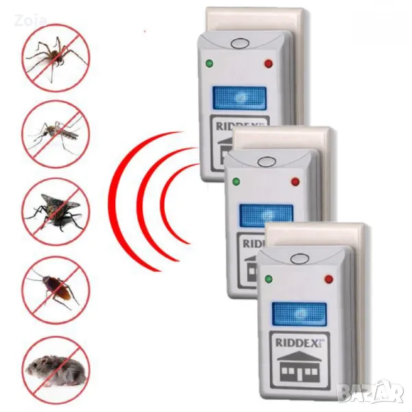 3бр. Уред против гризачи, хлебарки, мравки, паяци RIDDEX - Защитете дома си от мишки, плъхове, хлебарки, бълхи и мравки с RIDDEX!Този уред атакува нервната система на домашните вредители и ги кара да напуснат защитаваната от уреда територия. Честотата на излъчвания сигнал се променя "вълнообразно", което не позволява на вредителите да свикнат с него и гарантира ефективността на уреда.