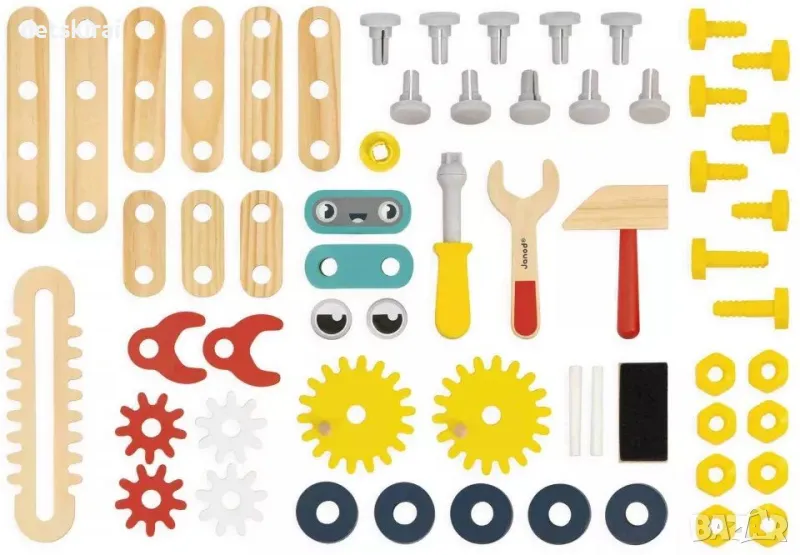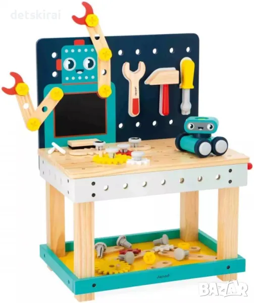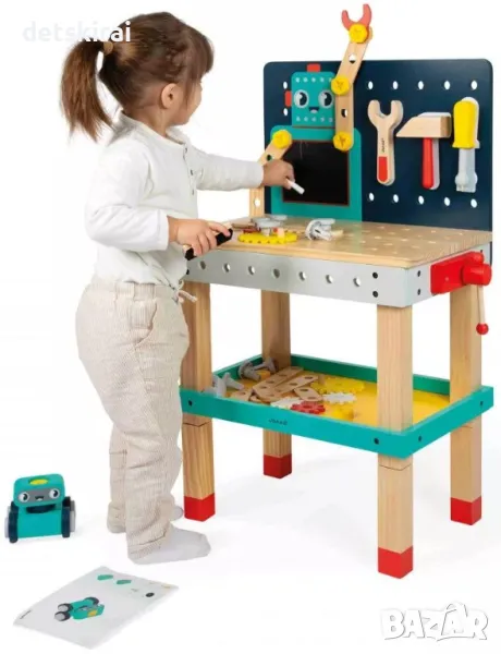 Работната маса от Janod Brico Kids е идеална за деца на 3 и повече години, които обичат да строят и майсторят. Тази работна маса с регулируема височина от 33 cm до 50 cm насърчава въображението, креативността и фините двигателни умения на малките майстори. Включва над 50 аксесоара: 3 магнитни дървени инструмента (гаечен ключ, чук, отвертка), 7 зъбни колела, 9 дървени дъски, комплект пластмасови елементи, 2 пръчки тебешир и 1 четка. Функции като странично менгеме, място за съхранение и магнитни държачи за инструменти добавят реализъм към този невероятен комплект. Децата могат да сглобяват ръце на роботи и да построят малък робот на колела от 7 части. Работната маса е проектирана с ярки цветове и естествено дърво за забавна и изобретателна игра, която ще се хареса на всяко едно дете.