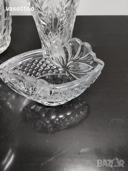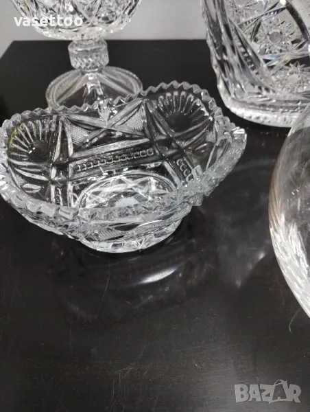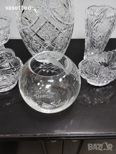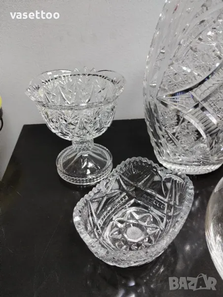 Уникална масивна ваза от полски кристал 30 см.,купа на столче 16/15 см.,ваза 20 см.,купички за ядки 7/16 и 9/17 см., гравирана купа колба с посвещение 16/18 см. Цени от 10 до 80 лв.При интерес, мога да пусна допълнителни снимки на Вайбър. Моля, разгледайте и другите ми обяви, има много красиви неща! Фруктиерата на столче-ПРОДАДЕНА!
