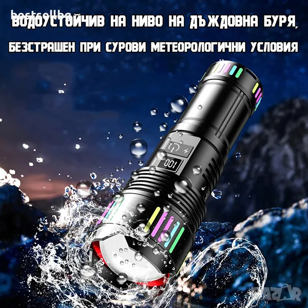 - Режими на работа: Висок, среден, нисък, мигане, SOS