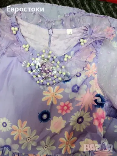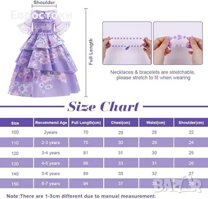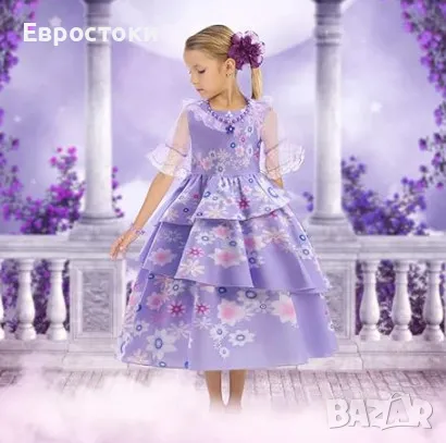 Детска рокля на Изабел има разкроената пола, обло деколте, уникални ръкави от органза и ярките шарки. Комплект включва лилава гривна и колие на Изабел.
