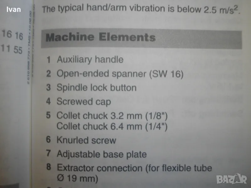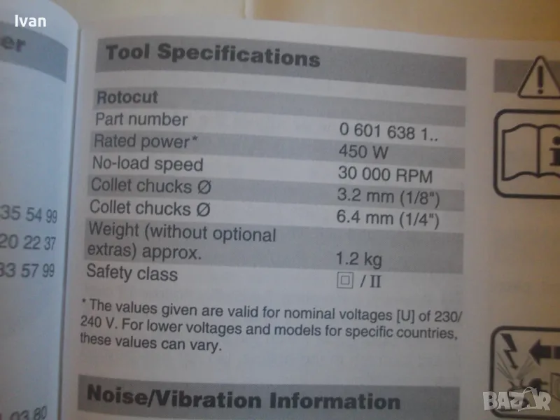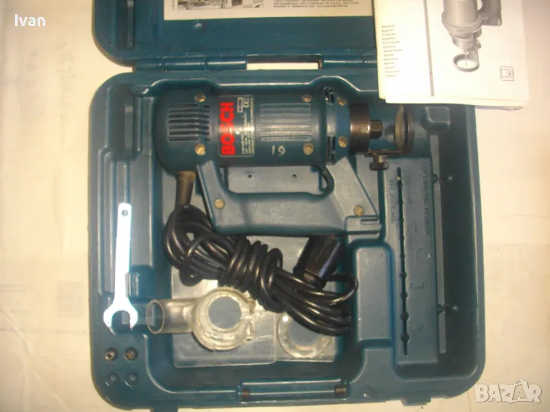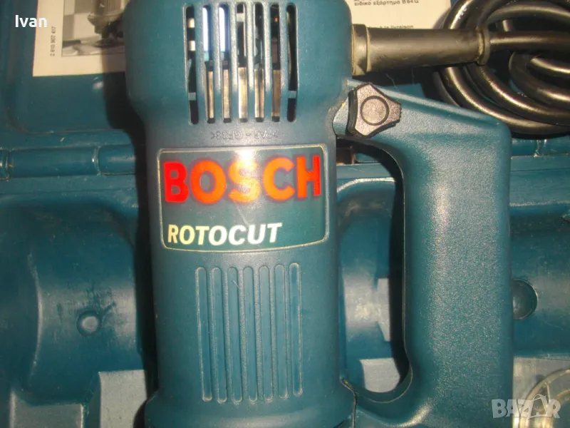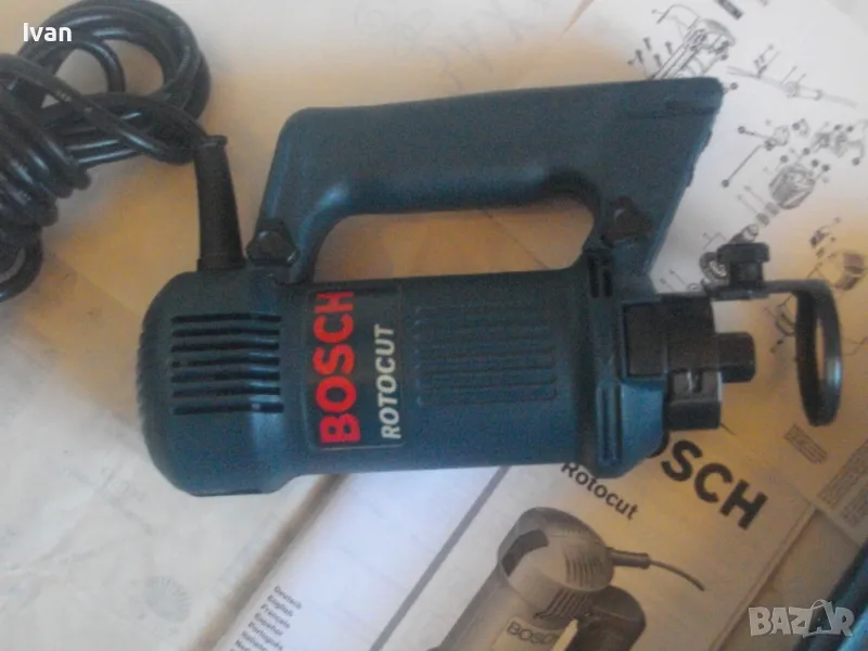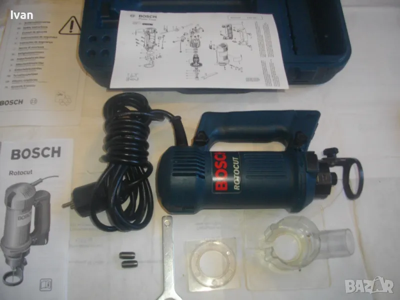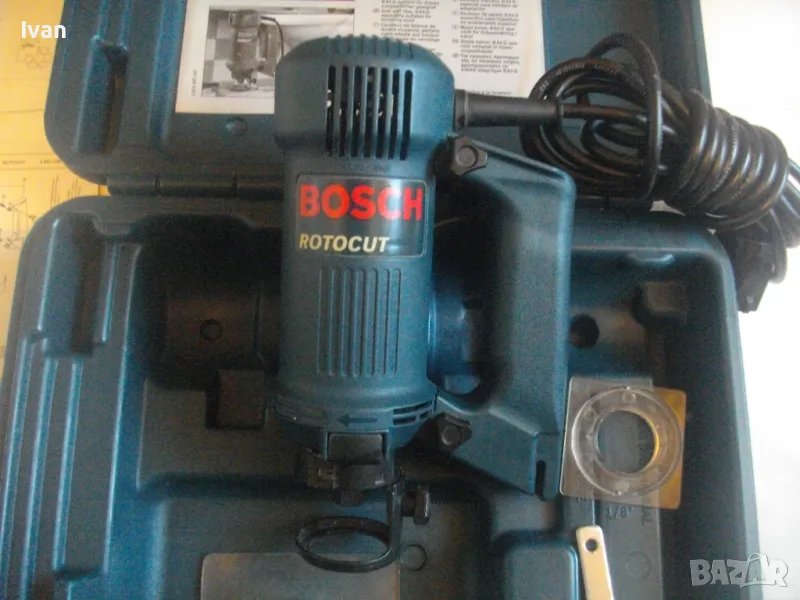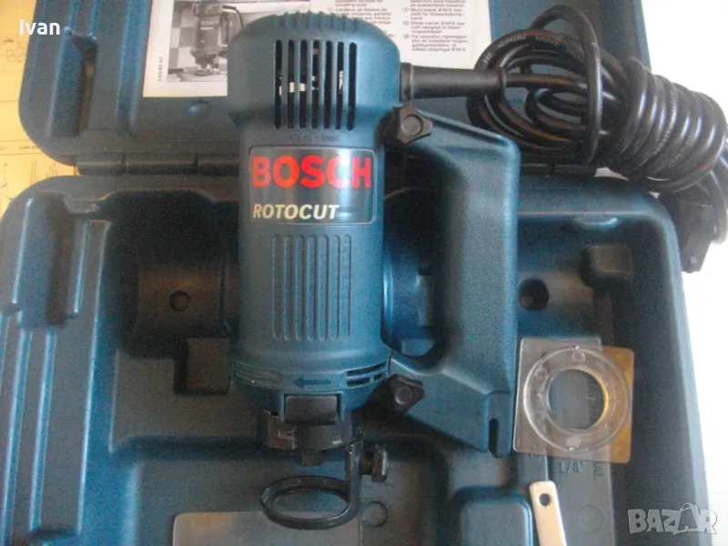 ОПИСАНИЕ на синя серия професионална електрическа фреза за кантове тип прав шлайф, профи модел на Бош - цена 399 лв. Оригинално САЩ производство, обуславящо цената. Марка и модел на машината BOSCH ROTOCUT R 182 - Made in USA. Машината е нова, без забележки, в отлично работно състояние. Характеристики - 230V - 50 Hz - 450W - 30 000 min. 2001 Robert Bosch GmbH. 2 бр. цанги към машината и оригиналната гайка за притягането им. Ключ гаечен оригинален за гайката. Книжки, указания, технически схеми на машината на небългарски езици. Цангите са стандартни универсални размери - 3,2 мм и 6,4 мм. Дълъг професионален кабел на машината, оригинален маркиран на марката. Снемащата се дръжка на машината за използване в труднодостъпни места като прав шлайф на фрезата. Регулиране дълбочината на обработка. Оригинална плексиглас плоча на главата. Приставка от плексиглас за прахоулавянето и скачването с прахосмкачка, която беше леко спукана, но е залепена и не пречи на цялостната работа. Оригинален куфар на машината със залепена листовка за модела машина и лого на марката от лицевата страна на куфара. Цялостно тегло с куфар и приставки - 3,0 кг, тегло само фрезата - 2,0 кг. Цена на комплекта 399 лв.