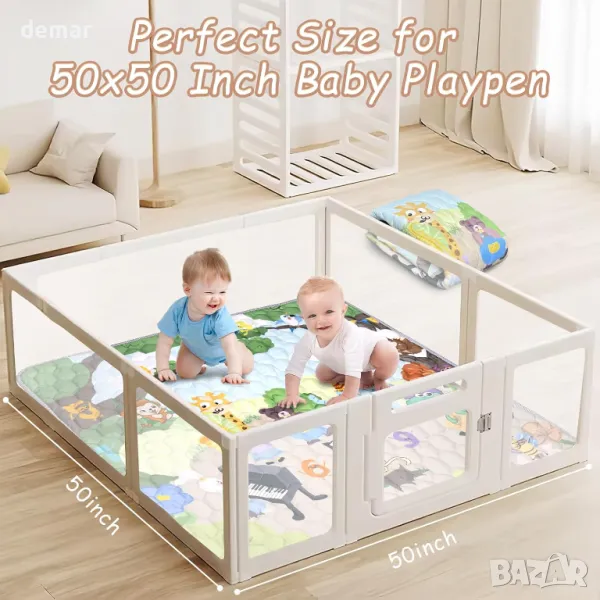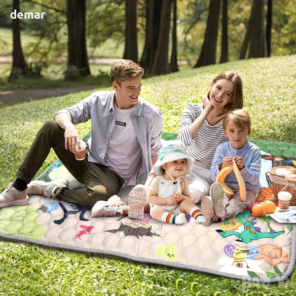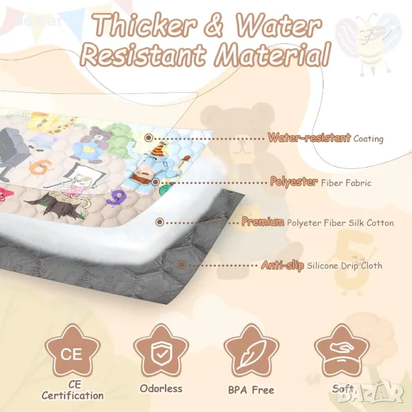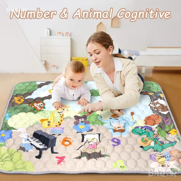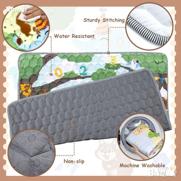 Бебешката постелка Funsland се отличава с мек дизайн без мирис, изработен от първокласни памучни и полиестерни влакна, с дебелина 1 см за комфорт. Той включва водоустойчива технология за лесно почистване и е устойчив на разкъсване с подсилени ръбове. Неплъзгащото се дъно гарантира безопасност по време на игра, докато постелката може да се пере в пералня за удобство. С размери 50x50 инча в разгънато състояние съчетава забавление и учене с ярки цветове, сладки животни и числа, за да стимулира въображението и когнитивните умения. Освен това тази преносима постелка за игра е универсална за употреба на закрито и на открито, което я прави идеална за различни дейности като пикник и пътуване.